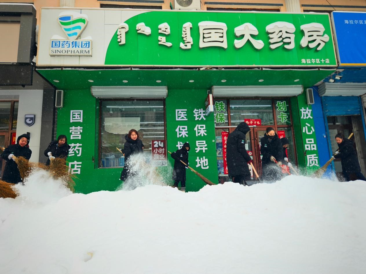 受极寒天气影响,呼伦贝尔普降大雪,给市民出行和一线门店运营带来不便。为践行“二线服务一线”理念,呼伦贝尔国大药房党工团联动,组织职能部门员工下沉一线,对海拉尔区多家门店开展帮扶清雪作业。员工们不畏严寒、分工协作,为顾客清理出安全畅通的出行通道。此次行动既是践行服务承诺的体现,也是雷锋精神融入工作的实践,既保障了出行安全,更凝聚了团队力量,彰显了企业的责任温度。